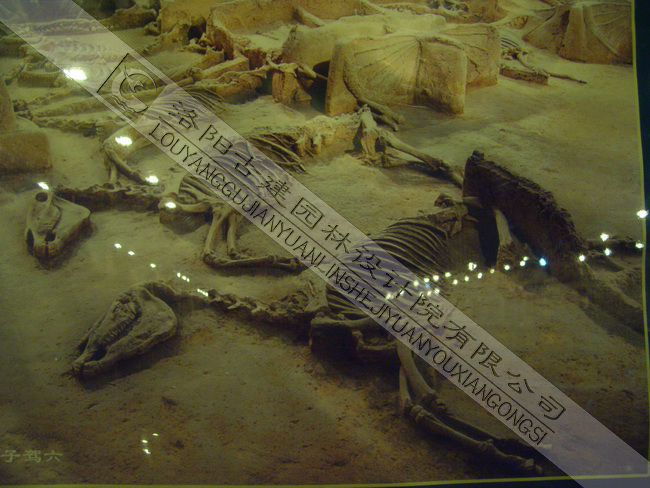 整個(gè)博物館占地1700多平方米,為半地下式建筑,地面高度,3.6米,地下深度5.4米。分為兩個(gè)展區(qū):第一展區(qū)分四個(gè)板塊,一是洛陽(yáng)地區(qū)5大都城與當(dāng)代洛陽(yáng)相互位置關(guān)系的圖版;二是東周王城概況;三是王陵的探索與發(fā)現(xiàn);四是珍貴的東周文物。第二展區(qū),東周時(shí)期大型車(chē)馬坑展區(qū)。這里展示的是2002-2003年,考古工作者發(fā)掘清理的17座車(chē)馬坑(馬坑)中的2座。其中北邊一座,規(guī)模系國(guó)內(nèi)少見(jiàn),其車(chē)馬呈縱向兩列的排放,宛如出行陣列的場(chǎng)面,更顯精彩。最令世人矚目的是唯一一輛"駕六"的發(fā)現(xiàn),以直觀(guān)清晰的形式印證了古文獻(xiàn)中"天子駕六"的記述,這也是世界上唯一一處原址展示的"天子駕六"。