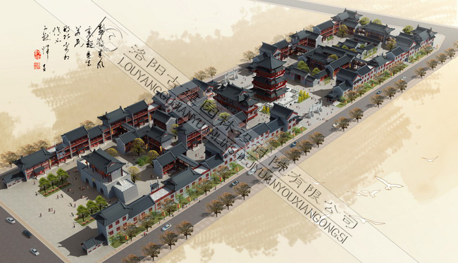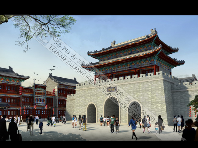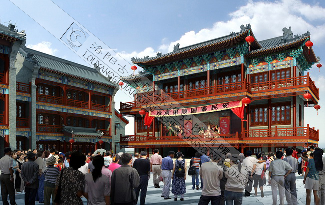 祭城古街自北向南設(shè)計(jì)了四個(gè)段落分區(qū),分別為“祭城掠影”,“歌舞升平”,“鼓樓鐘聲”和“古城遺韻”。